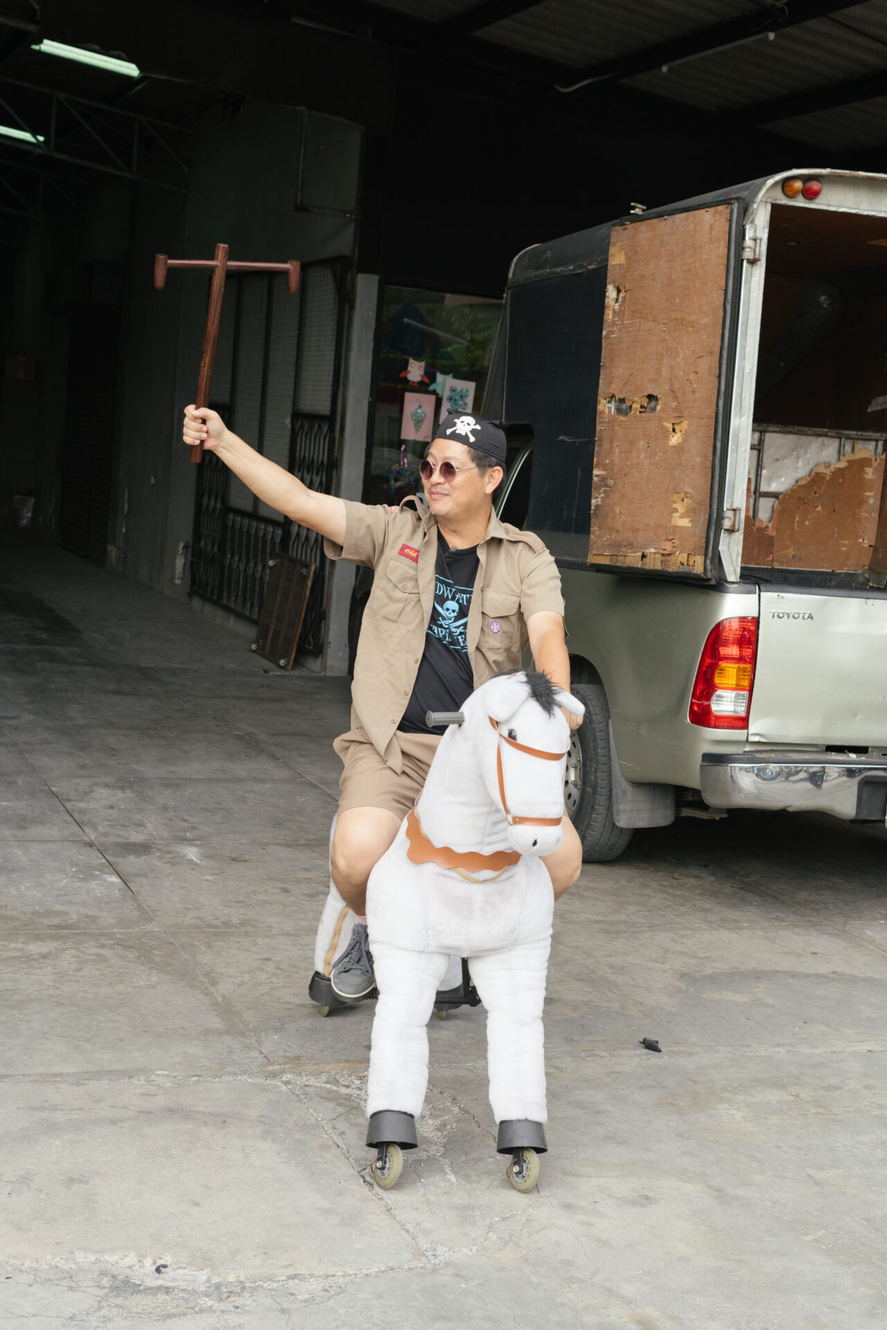 บก.ลายจุด ขี่ม้าไม้พร้อมกวัดแกว่งดาบพลาสติกเข้ามาในฉาก