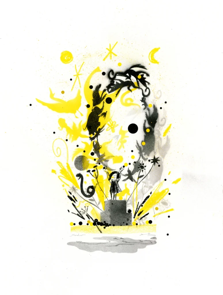 ใน Shadow โลกทั้งเล่มมีเพียงสองสี เหลืองกับดำ สีเหลืองคือพื้นที่แห่งแสง ความคิด และจินตนาการ ส่วนสีดำคือโลกของความจริงและขอบเขต เมื่อเงาของสิ่งของกลายเป็นสัตว์ในความฝัน เส้นแบ่งของทั้งสองสีเริ่มเลือนจนกลายเป็นสิ่งเดียวกัน การไม่มีคำในภาพไม่ได้ทำให้เรื่องราวแน่นิ่ง แต่มันกลับเคลื่อนไหวอยู่ตลอดเวลา ผ่านจังหวะของแสงที่เปลี่ยนจากด้านหนึ่งไปอีกด้านหนึ่ง